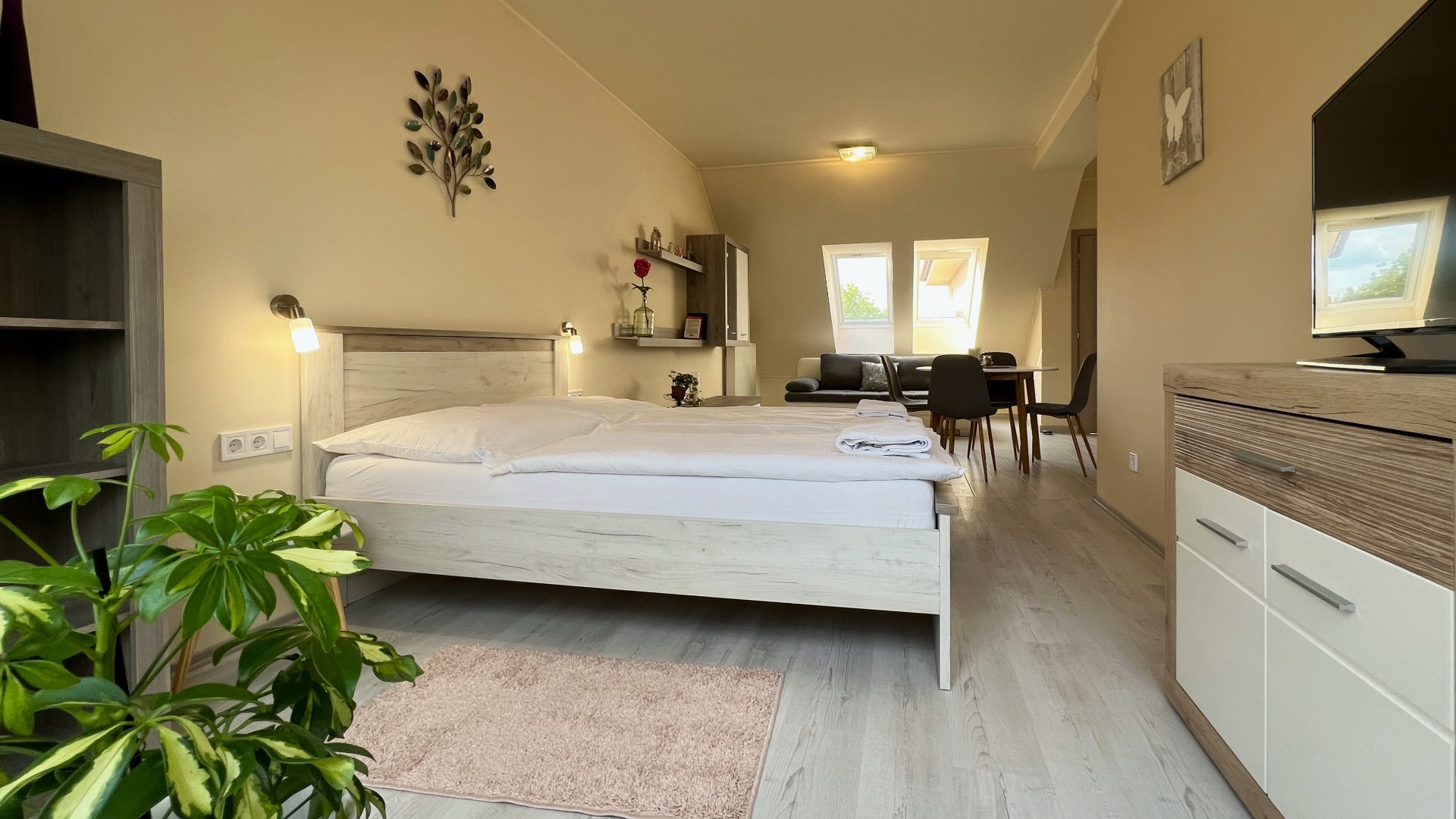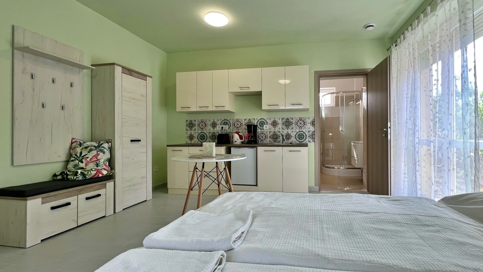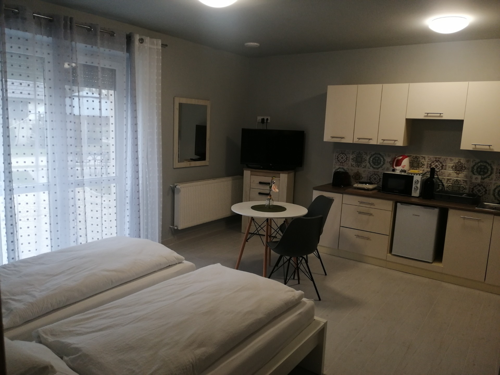 Mozgássérült, kerekesszékes és mozgásukban korlátozottabb vendégeink részére került kialakításra ez az apartman és még azoknak is ,akiknek probléma egy szűk nyílású zuhanykabinba történő bejutás. A parkolóból lépcső és szintkülönbség nélkül be lehet jutni a szobába.Alacsonyra helyezett villanykapcsolók,padlószintben elhelyezett nagy méretű zuhanytálca és a mosdóhoz is könnyedén közel lehet kerülni.Az apartman felszereltsége megegyezik a többi apartmanéval,kivéve, hogy nem franciaágy van , hanem kettő db 90x200m-es szimpla ágy.