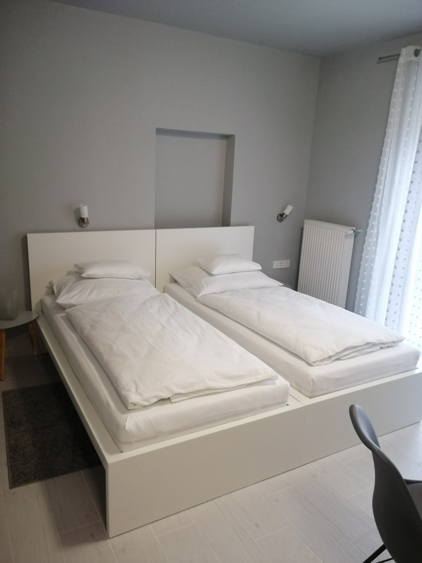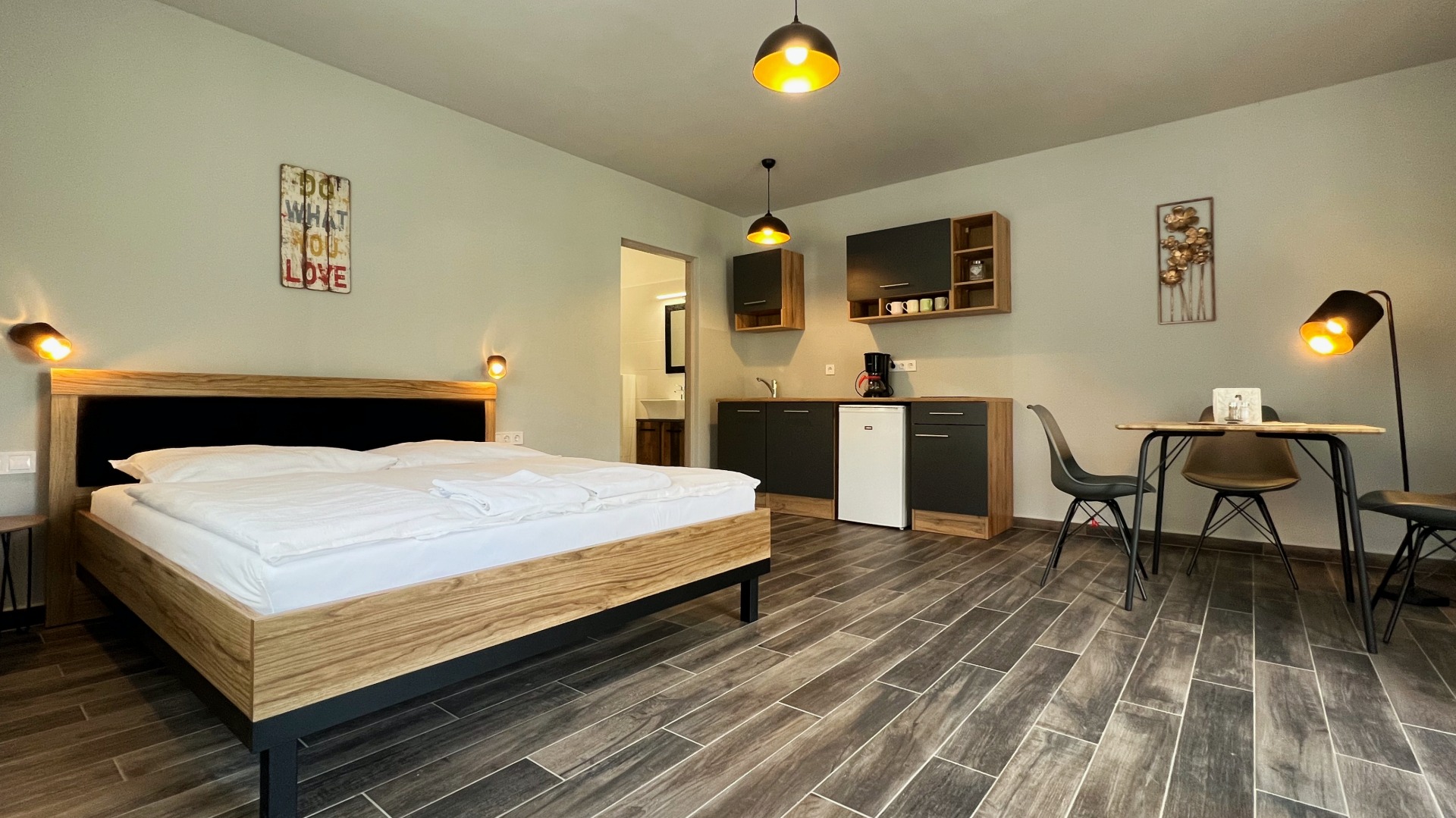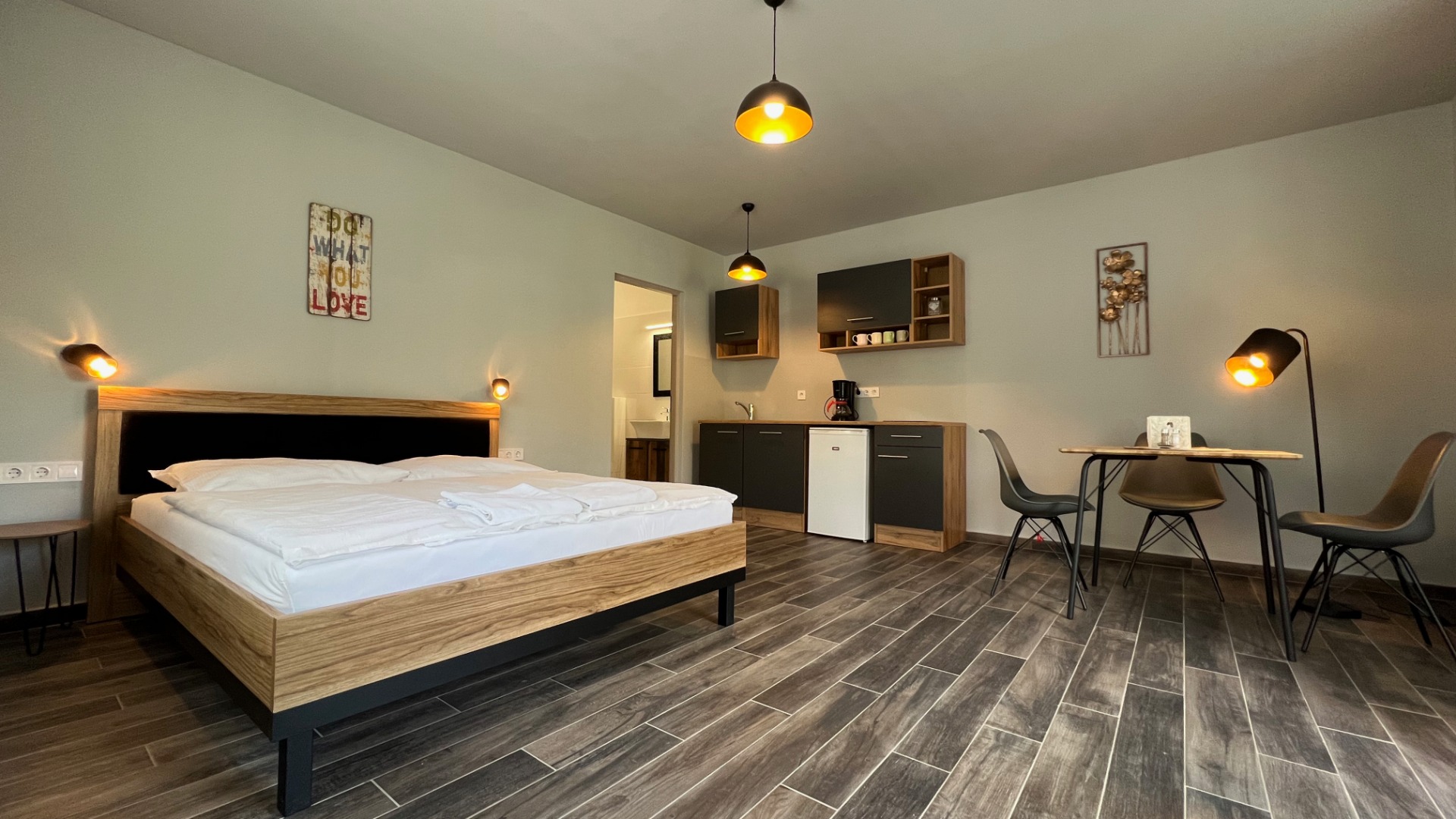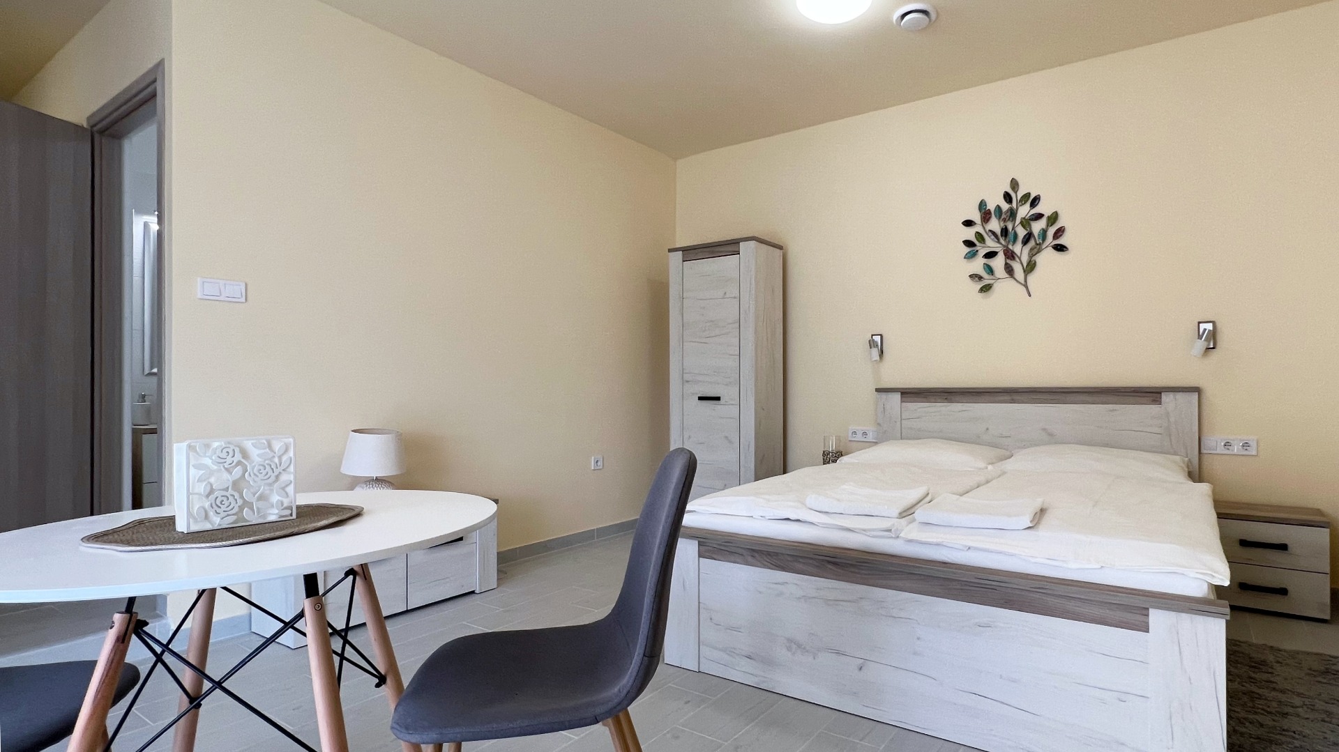 Mozgássérült, kerekesszékes és mozgásukban korlátozottabb vendégeink részére került kialakításra ez az apartman és még azoknak is ,akiknek probléma egy szűk nyílású zuhanykabinba történő bejutás. A parkolóból lépcső és szintkülönbség nélkül be lehet jutni a szobába.Alacsonyra helyezett villanykapcsolók,padlószintben elhelyezett nagy méretű zuhanytálca és a mosdóhoz is könnyedén közel lehet kerülni.Az apartman felszereltsége megegyezik a többi apartmanéval,kivéve, hogy nem franciaágy van , hanem kettő db 90x200m-es szimpla ágy.